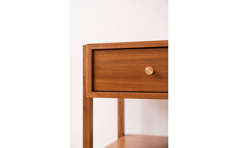Mesa de cabeceira com estrutura (pés) em madeira maciça e corpo em mdf usinado revestido com lâmina de madeira. Gavetas equipadas com corrediças ocultas e sistema de amortecimento e puxadores em latão.